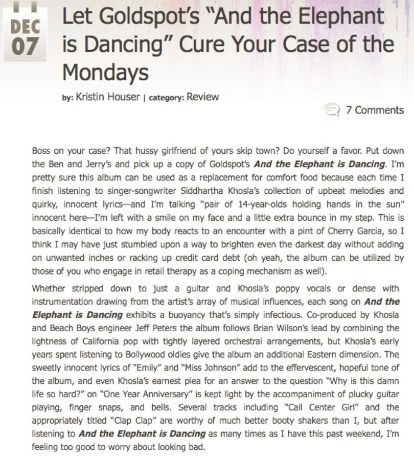 Songs from the film include 'The Grocery Store,' 'What's Under the House,' (from critically acclaimed 'And The Elephant is Dancing'), along with Goldspot's remake of the Bollywood classic 'Ina Mina Dika' and new track 'Foundations.' 'And The Elephant is Dancing' and 'Ina Mina Dika' are both available now.